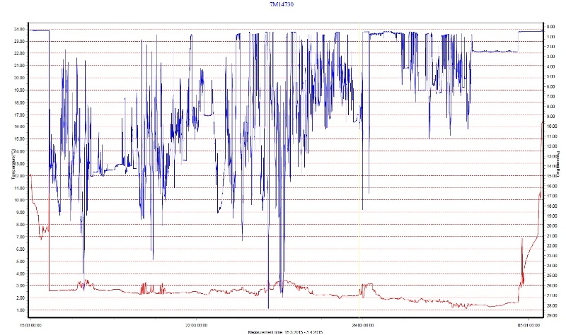 Á línuritinu hér fyrir neðan má sjá rauða línu sem endurspeglar hitastig sjávar og bláa línu sem gefur til kynna það dýpi sem fiskurinn hélt sig á. Myndin sýnir að fiskurinn hefur ferðast mjög mikið upp og niður í vatnssúlunni allt frá því að vera töluverðan tíma nánast í yfirborði og síðan niður á um 280 metra dýpi. Í lokinn má sjá að fiskurinn festist í neti á tæplega 3. metra dýpi og er síðan dreginn upp. Áhrif sjávarfalla má greina eftir að fiskurinn festist í netinu.